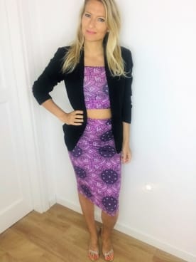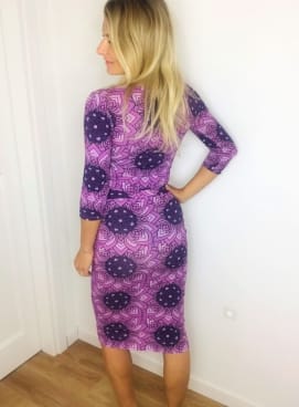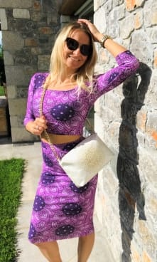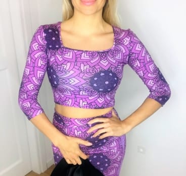 Dvodelna obleka z oprijetim krilom čez kolena in kratko majico s 3/4 rokavi. Vijolično in polno ljubezni!