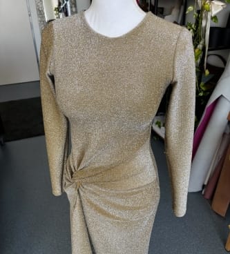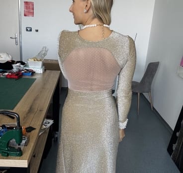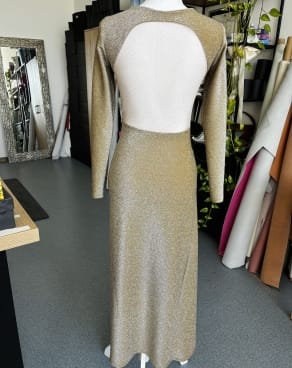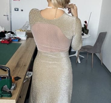 Čudovita zlata obleka z odprtim hrbtom, všitim nedrčkom in veliko dobre energije.