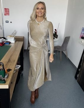 Zlata je ena najvišjih vibracij Vesolja in prinaša obilje. Tudi sama ga živim. Vem, da ga delim tudi preko modnih kosov. V tej obleki pa ga prav začutim.