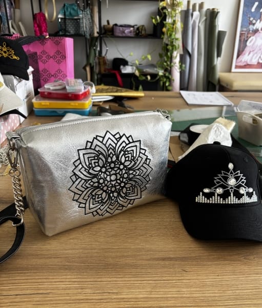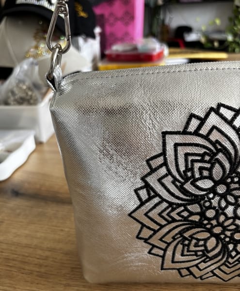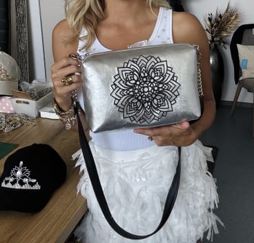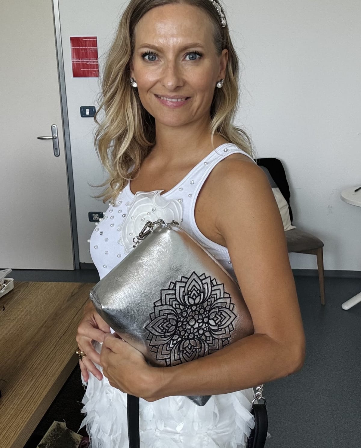 Srebrna torbica z URSHY vezenim simbolom ti podarja svež videz in energijo razcveta ženske duše.